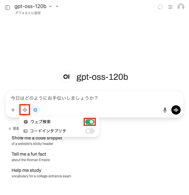 トップページに戻り、チャット入力バーの左下にある「Integrations」メニューボタンをクリックすると、ウェブ検索のトグルが表示されます。こちらをオンにしてチャットを送信してみましょう。