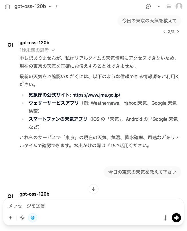 先程回答が得られなかった「今日の東京の天気」について回答を得ることができました!