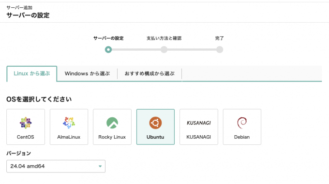 サーバーの設定画面が表示されるので、OS は「Ubuntu」を選択します。