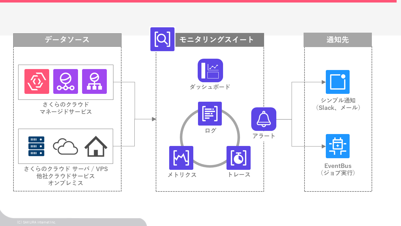 収集したデータはモニタリングスイートのダッシュボードで可視化できるのはもちろんのこと、アラートルールによるアラートをトリガーにして、「シンプル通知」でSlackやメールに送信したり、「EventBus」を介して特定のジョブを実行したりと、さくらのクラウドの他サービスと連携できます。