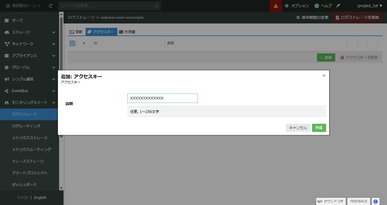 - 追加したログストレージの詳細を呼び出し、「アクセスキー」タブでアクセスキーを追加する