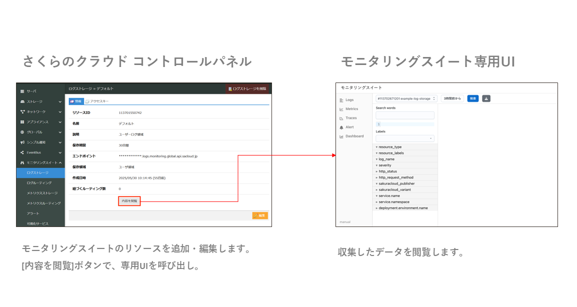 1つは、モニタリングスイート連携に対応した「さくらのクラウド」のマネージドサービスです。AppRunやデータベースアプライアンス・エンハンスドロードバランサなどが対応しており、各サービスのログとメトリクスを簡単にモニタリングスイートに連携できます。