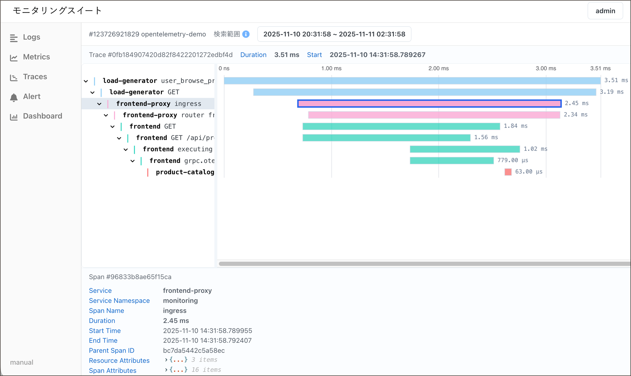 処理の流れを時系列で把握するため、分散トレーシングのデータを収集し、専用UIで可視化できます。