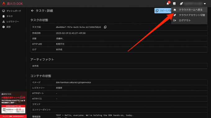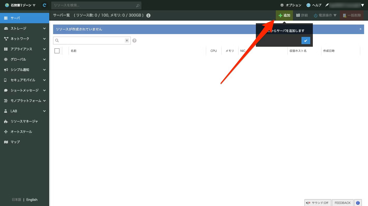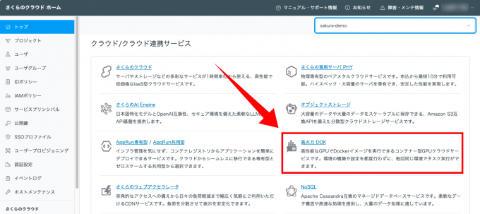 Dockerイメージを登録するコンテナレジストリを作成します。さくらのクラウドのホームで、さくらのクラウド を選択します。