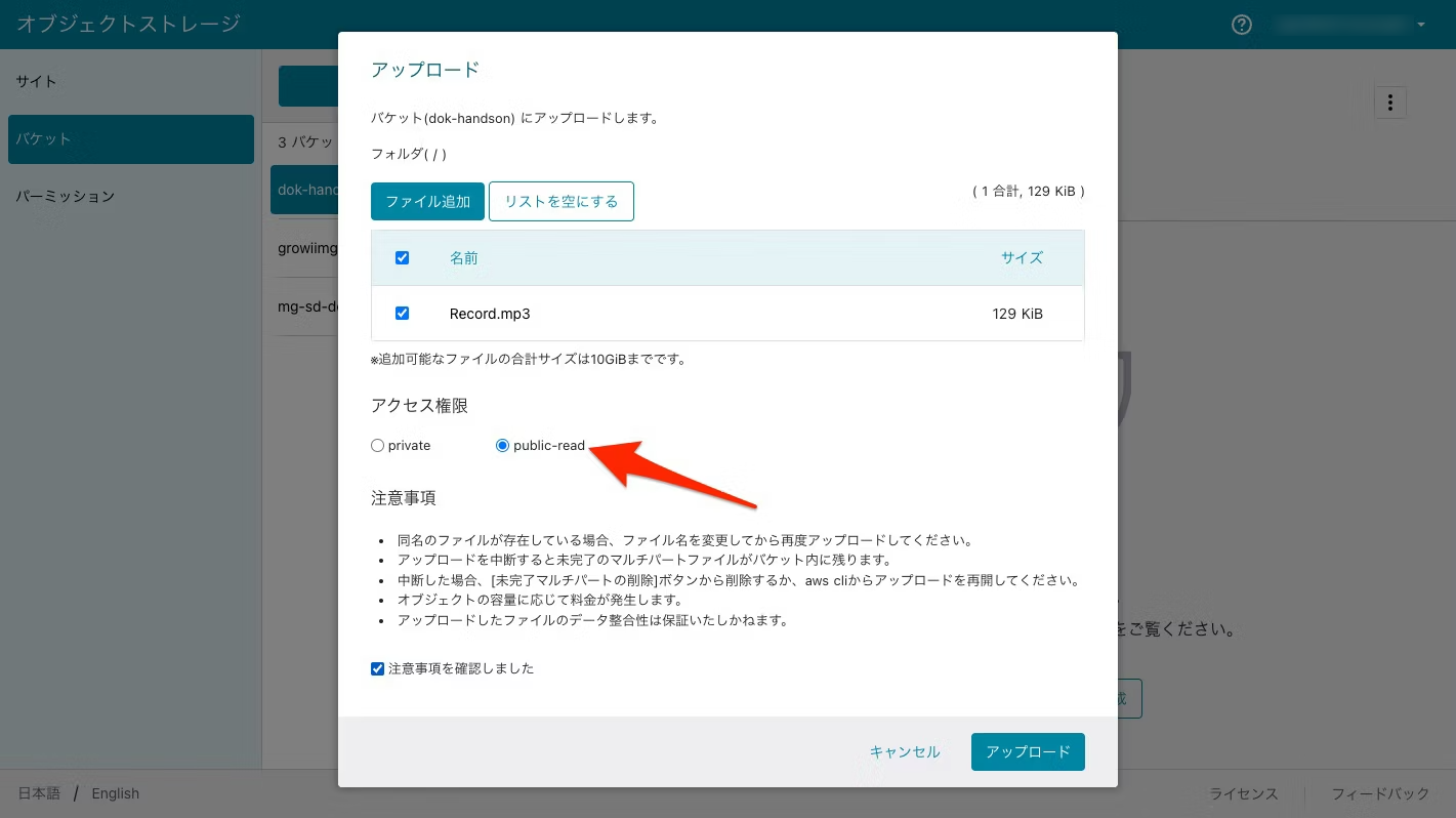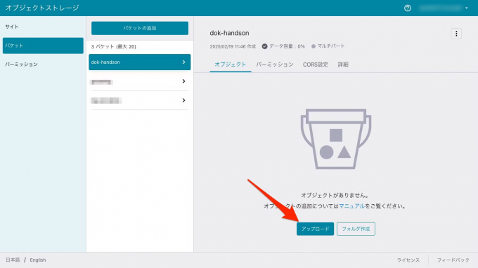 作成したバケットを選んで、 アップロード ボタンを押します。