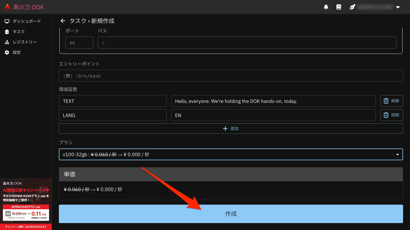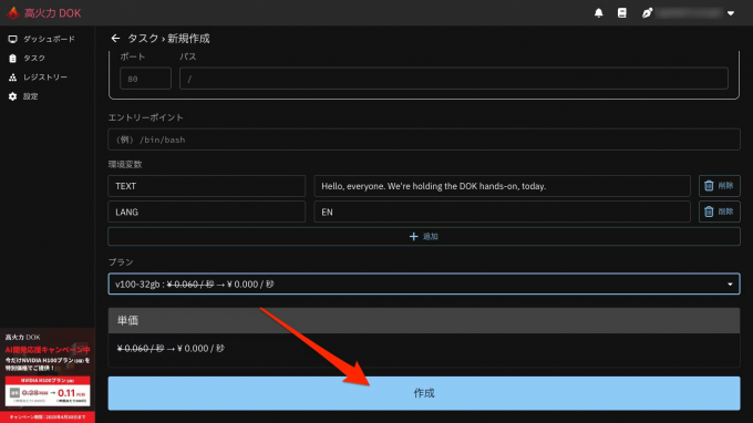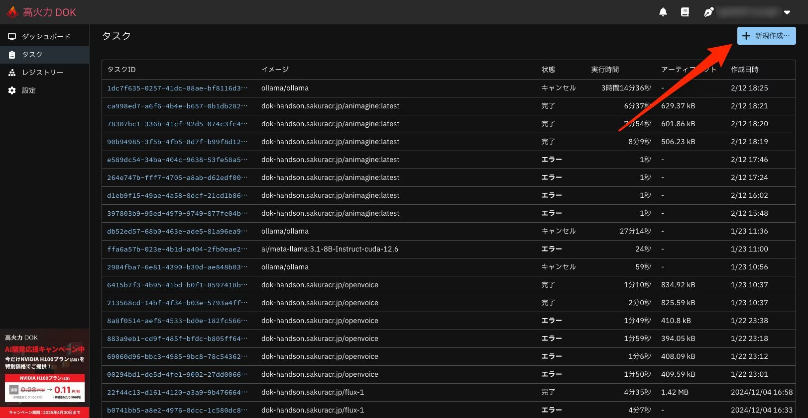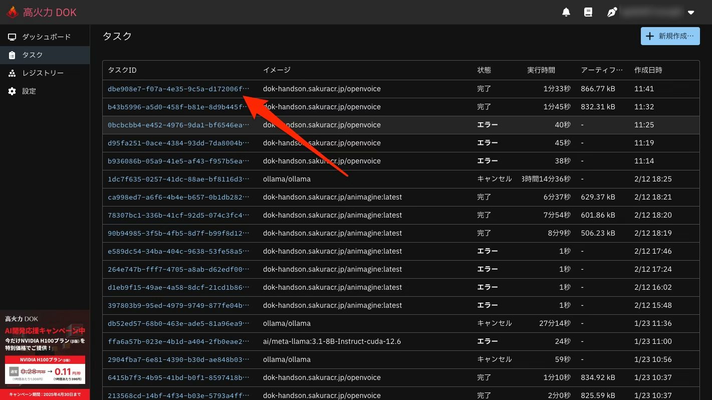 リポジトリがプッシュできたら、一番最初に行ったようにDOKでタスクを実行します。
