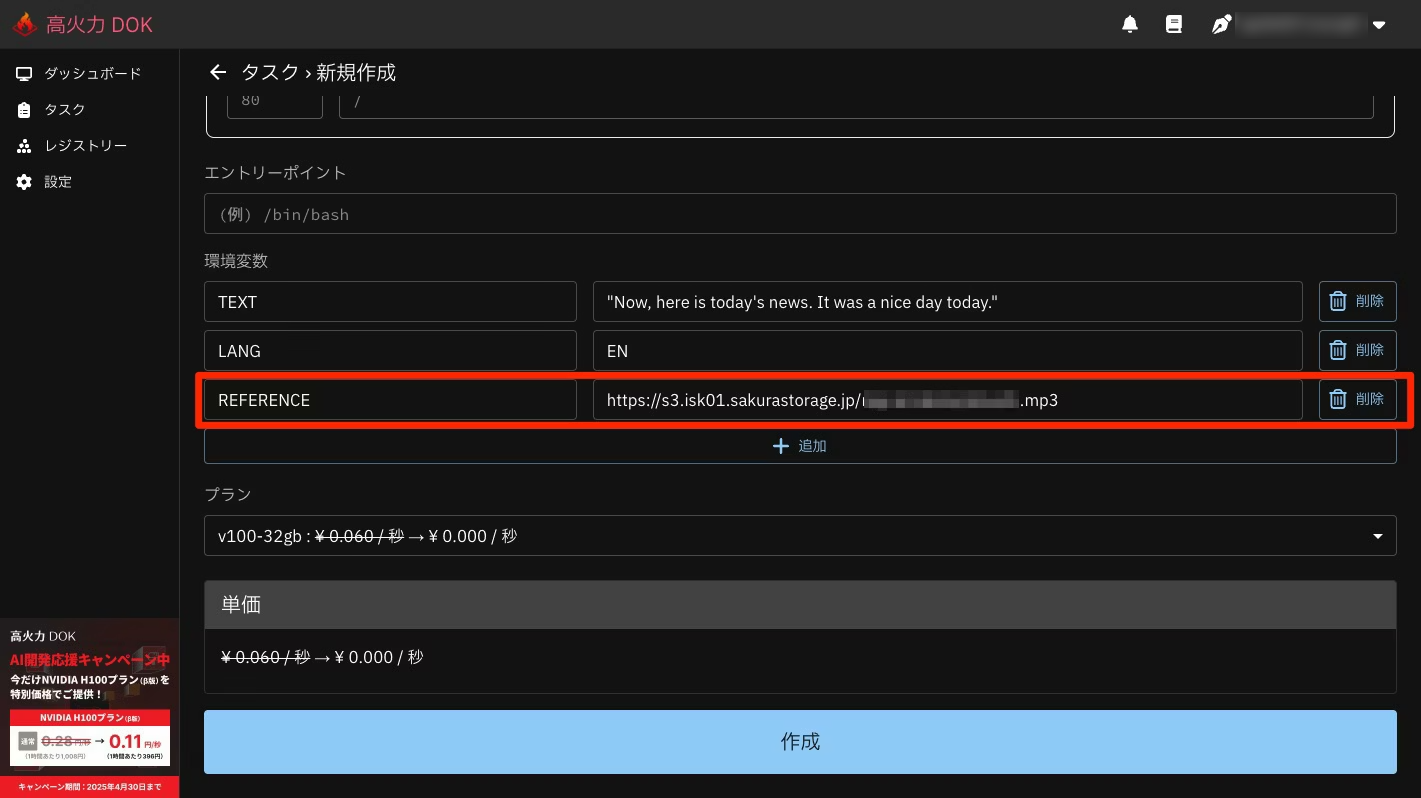 環境変数に REFERENCE を追加して、先ほどアップロードしたMP3ファイルのURLを設定してください。