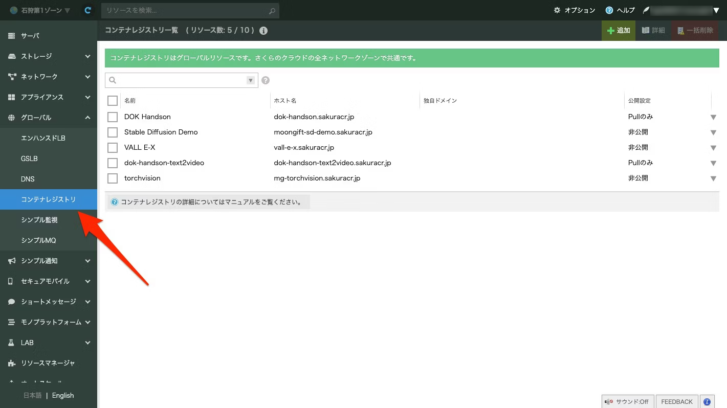 左側のメニューの グローバル の中にある コンテナレジストリ を選択します。