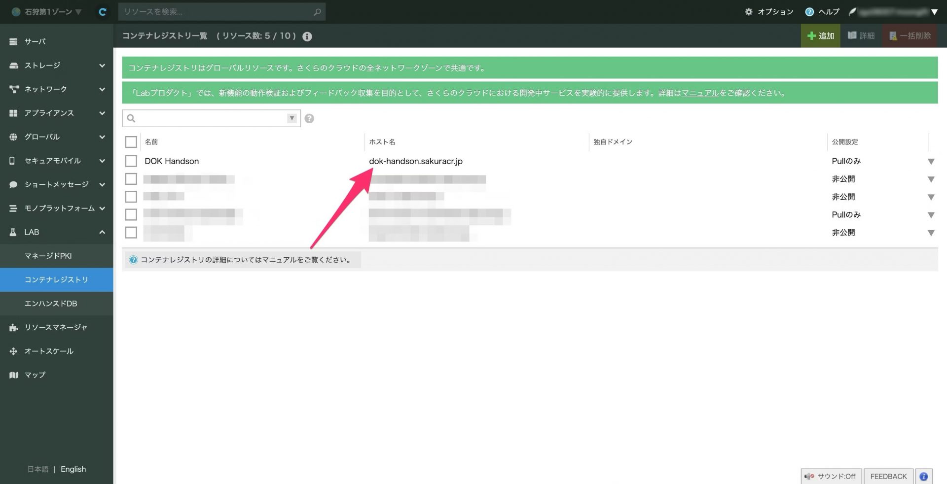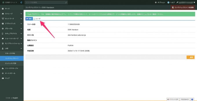 | コンテナレジストリ名 | ドメイン名に使われます。以下では、 EXAMPLE.sakuracr.jp として説明します。 |
