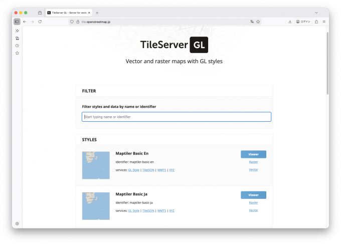 セッションの後半では、実際にタイルサーバの画面を見せながら説明がありました。タイルサーバの画面には数多くのスタイルが並んでおり、選択するとそのスタイルで地図が表示されます。地図データはOpenMapTilesスキーマに基づいて地球全体のデータが配信されていますが、竹島や北方領土などいくつかの特定地域はその地域専用のデータで上書きして表示するという処理が入っています。タイルサーバの配信URLなどはOSMのWikiにまとめられています。サーバの設定などはGitHubにまとめられています。