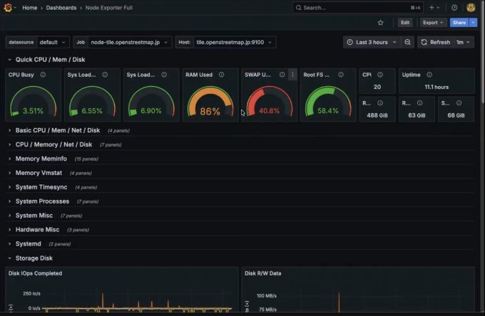 Grafanaの画面からは、メモリ使用率が86%、スワップ使用率は40%程度ということがわかりました。もっともスワップについては前日にサーバの再起動をかけたばかりなので少なめで、週末は80%ぐらいまで上がるとのことでした。htopコマンドでプロセスの稼働状況も見せていただきました。メモリはVarnishによる消費が多く、CPUはタイルサーバへのアクセスによる負荷が高いことがわかりました。