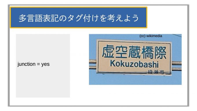 まず、例として神奈川県綾瀬市にある「虚空蔵橋際」という交差点に対するタグ付けの過程を説明し、タグ付けに関する問題として以下を挙げました。