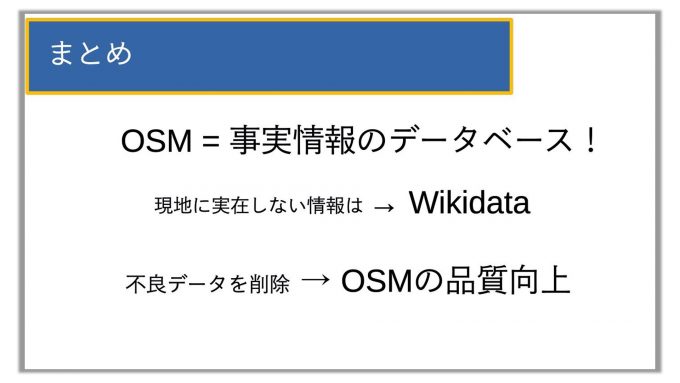 ただ、最近増えているバーチャル店舗(ネット上で実店舗名と異なる名称を名乗っている店舗)はどのようにタグ付けすべきかという課題があります。これについても、ネット上の情報はwikidataに記述し、OSMには現地にあるデータのみを記述するのがよいという考えを示しました。