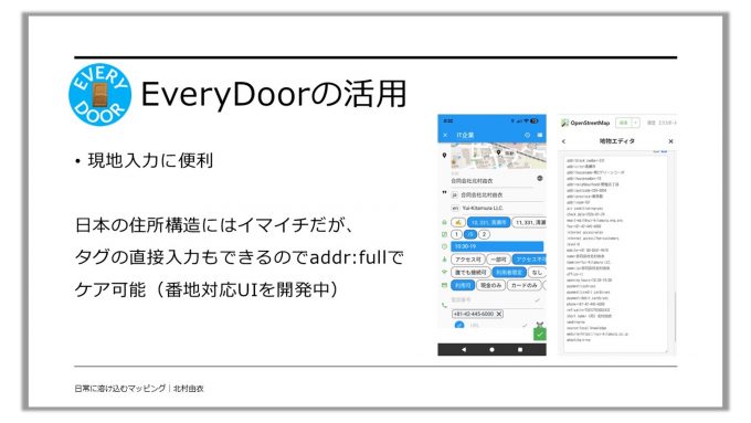 現地調査でのデータ入力に重宝しているツールがEveryDoorです。日本の住所構造に対応していないという難点はありますが、タグの直接入力もできて便利です。それから現地で撮った写真はMapillaryに載せます。これは特に森の中の道など、航空写真では見えない情報の補強に役立ちます。この他に、テキスト編集にLevel0、データ抽出にoverpass turboを使っています。