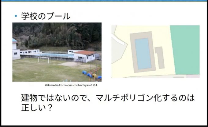 目的に応じた情報が提供されているかどうかという観点での問題提起として、学校のプールの例を挙げました。学校のプールをマルチポリゴンにしてbuilding=yesというタグを付けている例が多いが、プールは建物ではないのではないかという疑問を呈しました。また自転車の走行ルールが2026年4月から厳格化されますが、OSM上で利用者がルールを正しく理解できるようなタグ付けはどうすればよいかという問題も提起しました。
