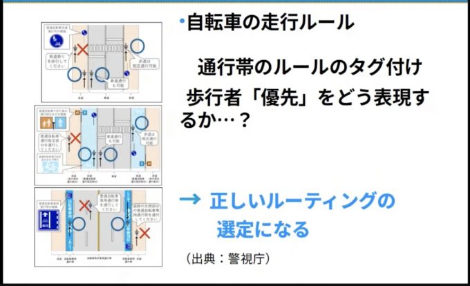 自転車の走行ルールについては、日本では自転車が歩道を走ってもよい場合がありますが、これをbicycle=yesとするのは適切か、歩行者優先というルールをどう表現するか、などの課題があります。日本における自転車の走行ルールは世界的に見ると特殊なところがあるようで、日本の道路事情に合わせたタグ付けを考えていく必要がありそうです。
