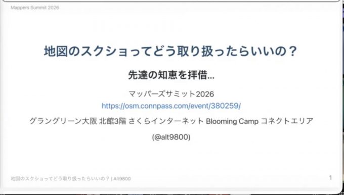 最後の発表者はalt9800さんで、地図のスクリーンショットに関するお悩み相談をしました。