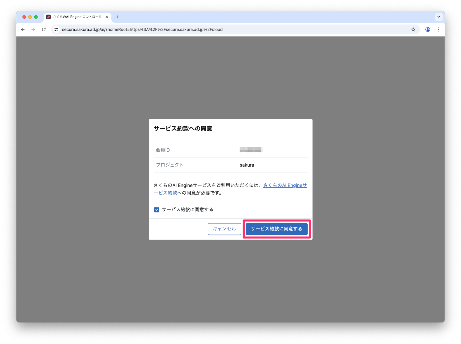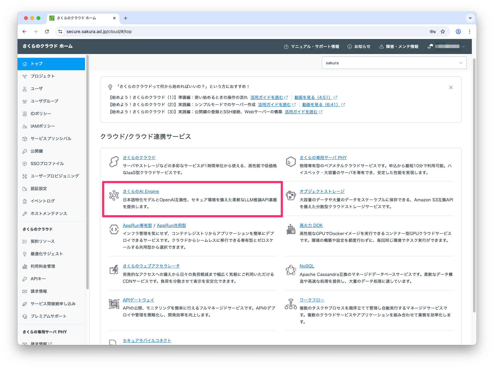 さくらのクラウドからログインし、「さくらのAI Engine」メニューから遷移します。
