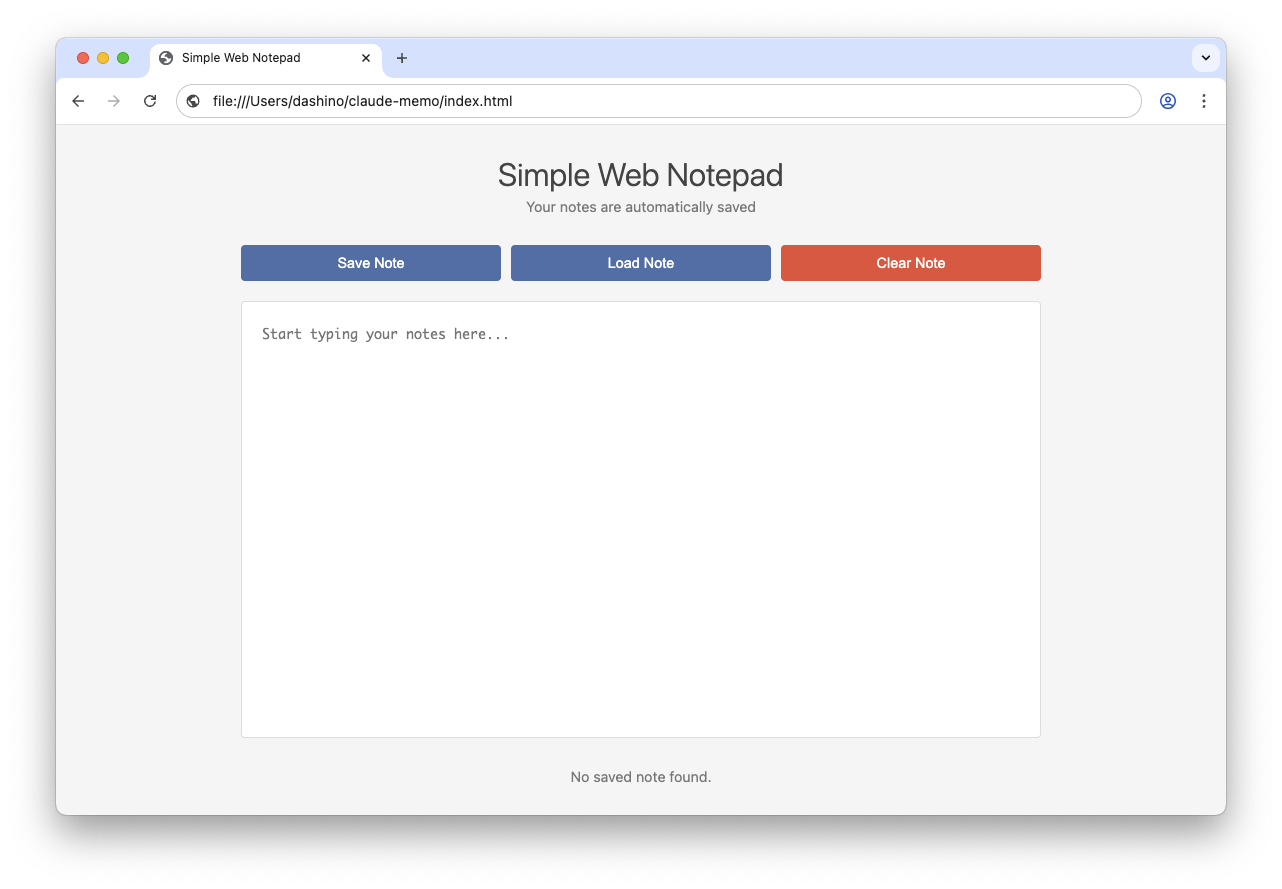 最後にplanモードからeditモードに切り替えて実行すると、Claude CodeがWebブラウザで利用できるメモ帳を生成します。追加でプロンプトを入力して、機能を拡張したり、変更したりできます。