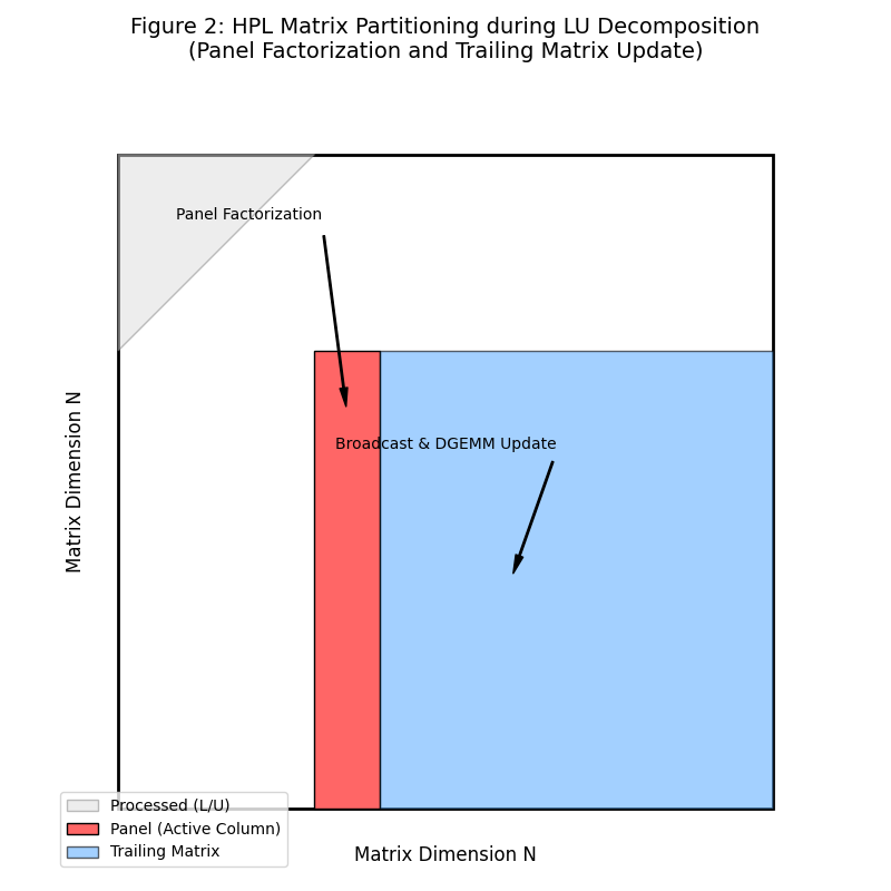 この繰り返しにより、最終的に行列全体がLU分解されます。この図は、HPLが巨大な問題を小さなブロックに分割し、組織的かつ反復的に計算を進めている様子を明確に表しています。イメージとしては、巨大なジグソーパズルを適度な大きさに分け、必要なピースを上手に交換しながら、全員で同時並行に組み上げていく感じになります。