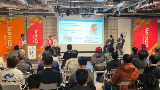 ホスト企業であるさくらインターネットのメンバーからは、主にNOCに関する報告がありました。ActiveLogicという装置を導入して通信の品質を計測したり、ダッシュボードなどをYouTubeで配信するといった取り組みが紹介されました。NOCに関する詳細はJANOG57のNOCページをご参照ください。