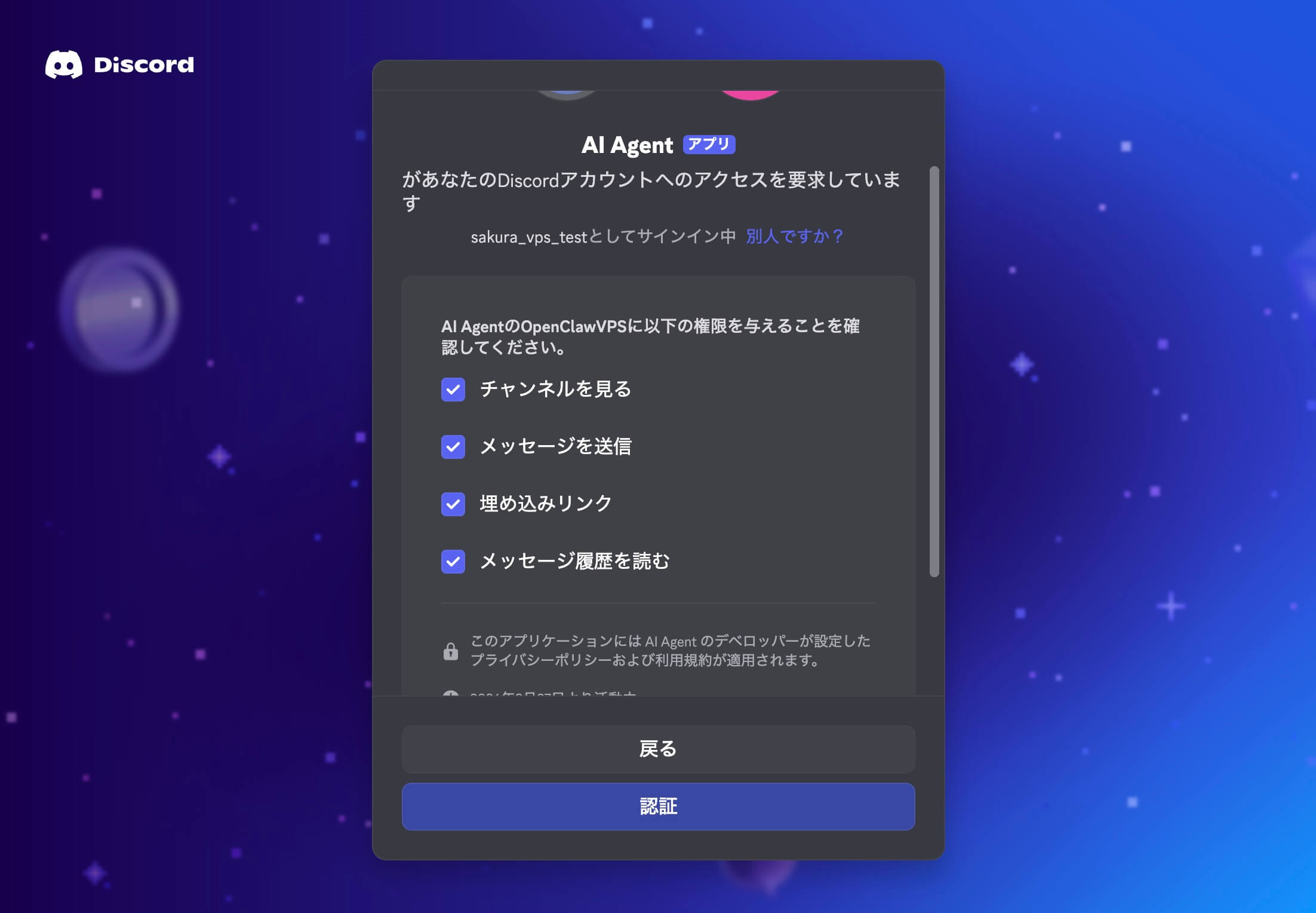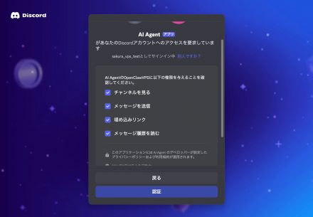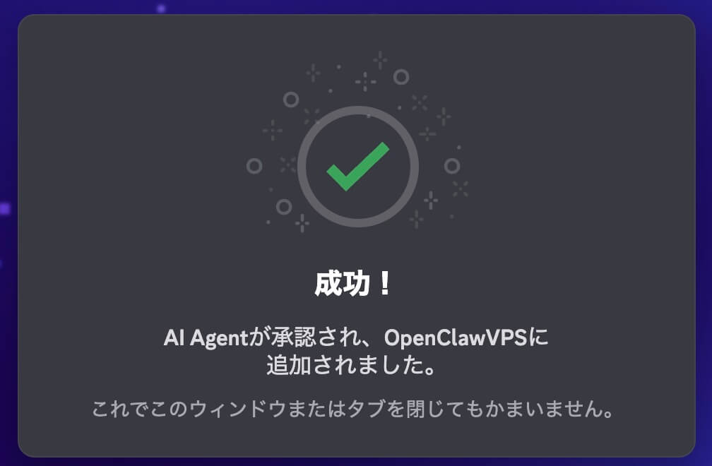 設定が完了した後に再度「Discordへメッセージを送信」を依頼してみてください。それが成功すればOpenClaw側のDiscordの設定は完了となります。