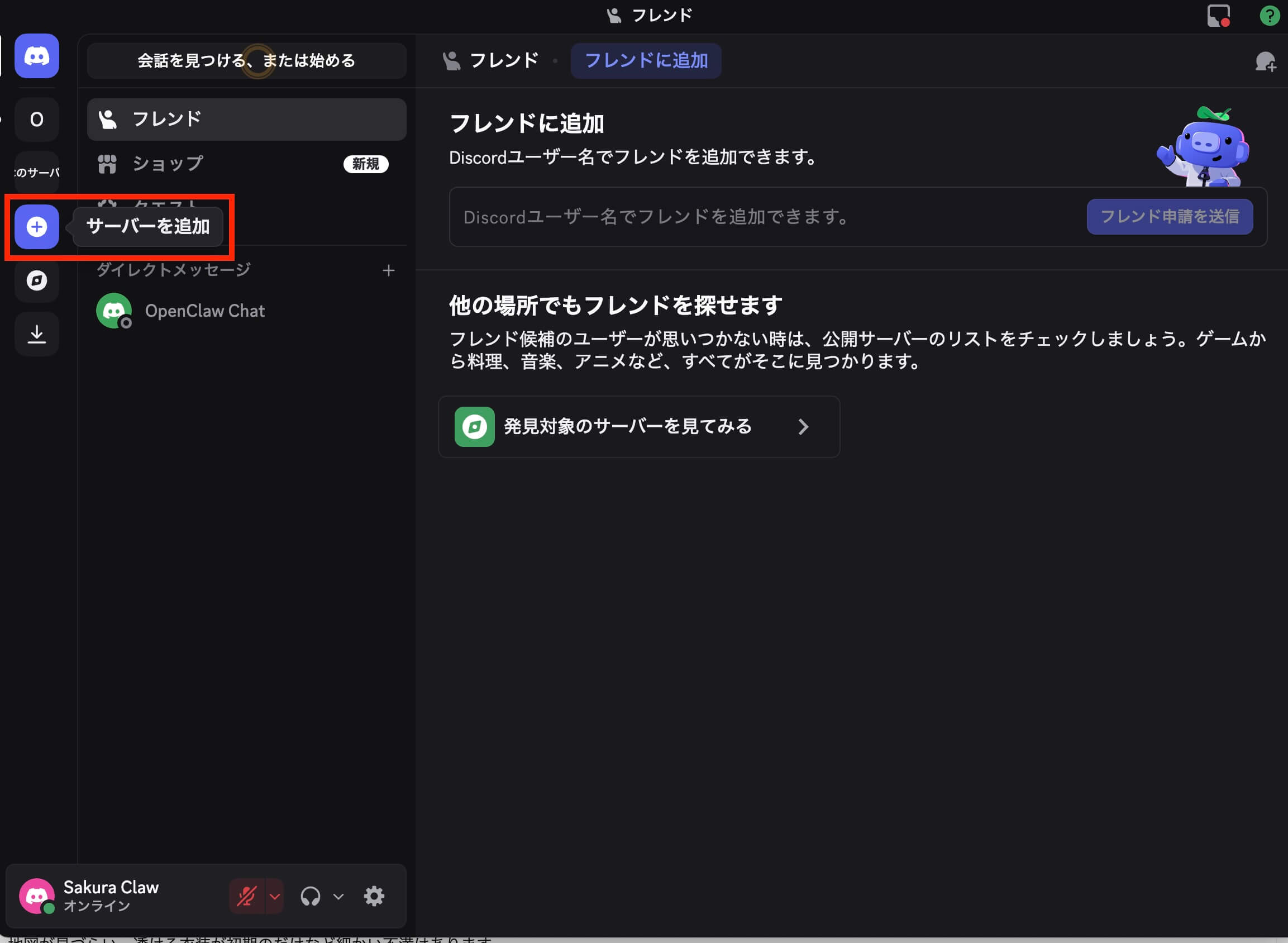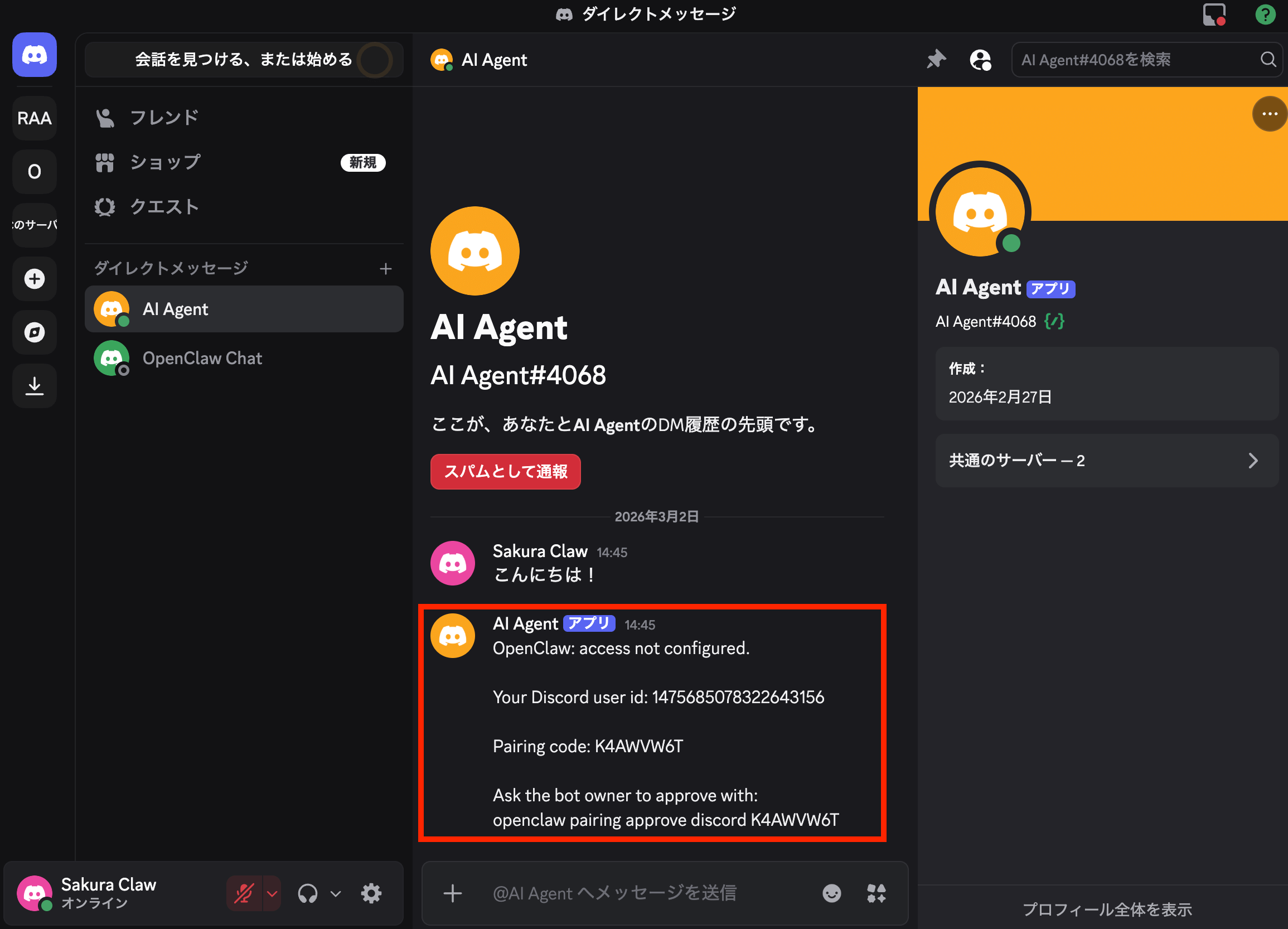 Discordクライアントで、右側のメンバー一覧にいるBotをクリックし、DM画面を開きます。メッセージウィンドウに「こんにちは!」と打ってみてください。この操作によって、OpenClaw側に「ペアリングリクエスト」が送られます。