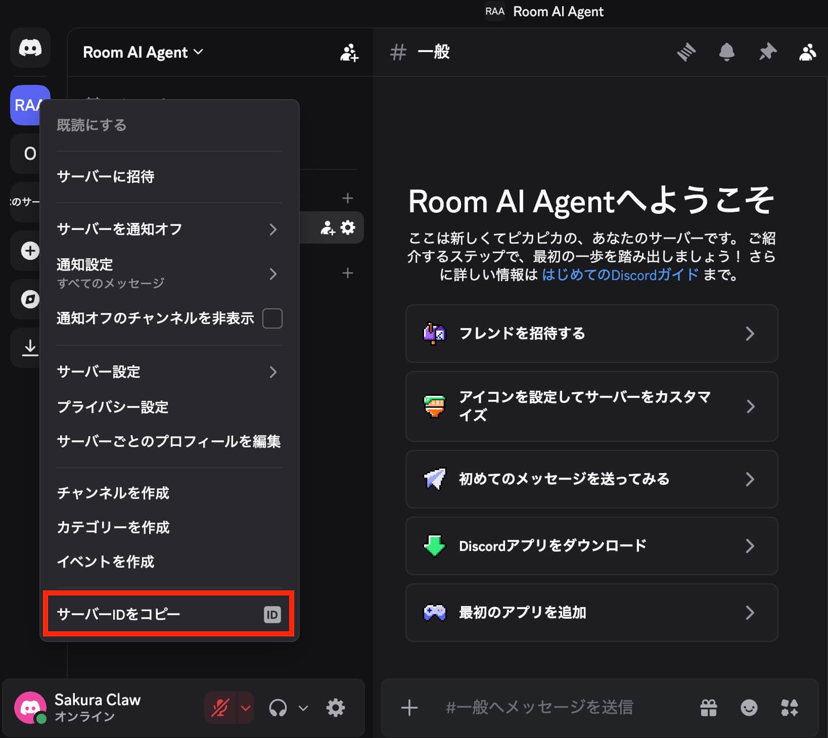 3. サーバーのアイコンを右クリックして「サーバーIDをコピー」を選択し、どこかに控えておきます。