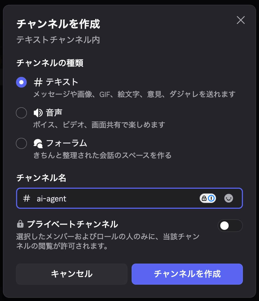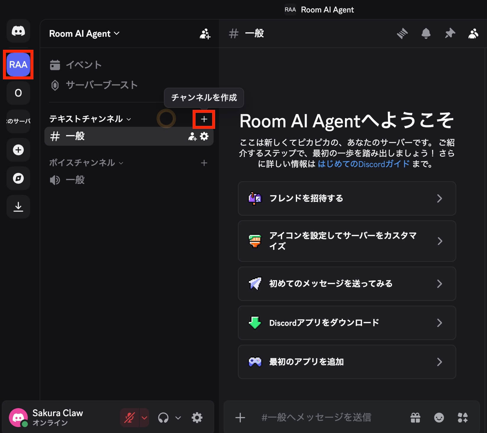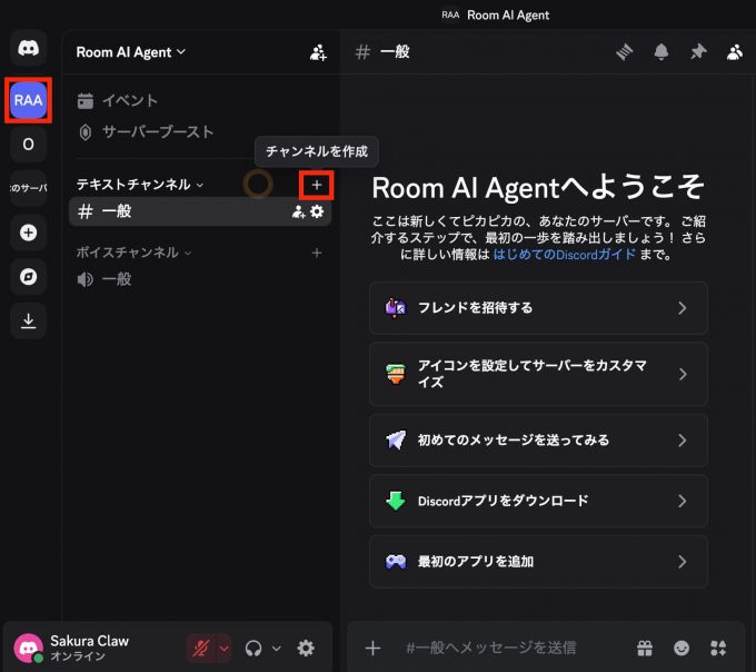 4. 左メニューから作成したサーバーを選択し、テキストチャンネル欄の「+」から新しいチャンネルを作成します。(チャンネル名は本記事ではai-agentとします)