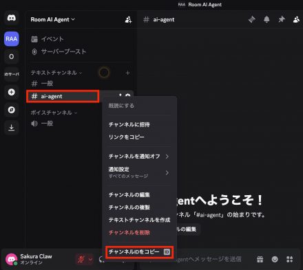 5. 作成したチャンネルを右クリックして「チャンネルIDをコピー」 を選択し、同じく控えておきます。