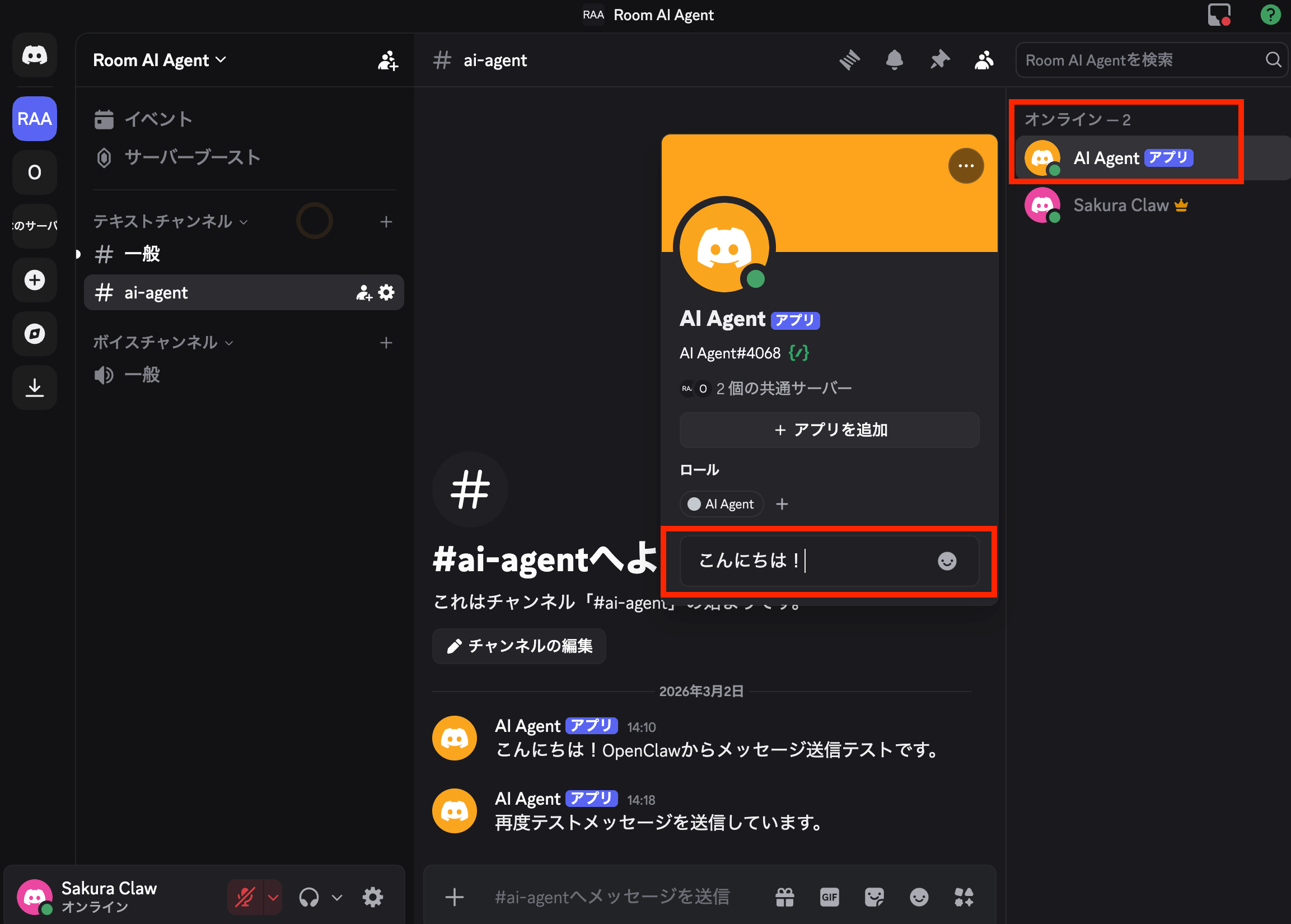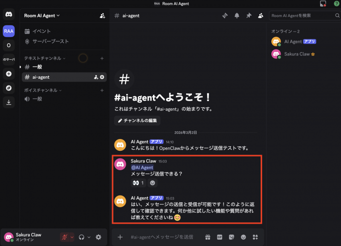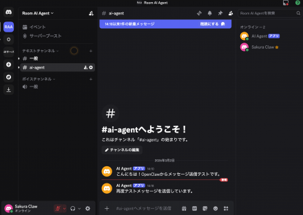 4. Discord 側のチャンネル(前述のai-agentなど)を確認し、メッセージが届いているかをチェックします。