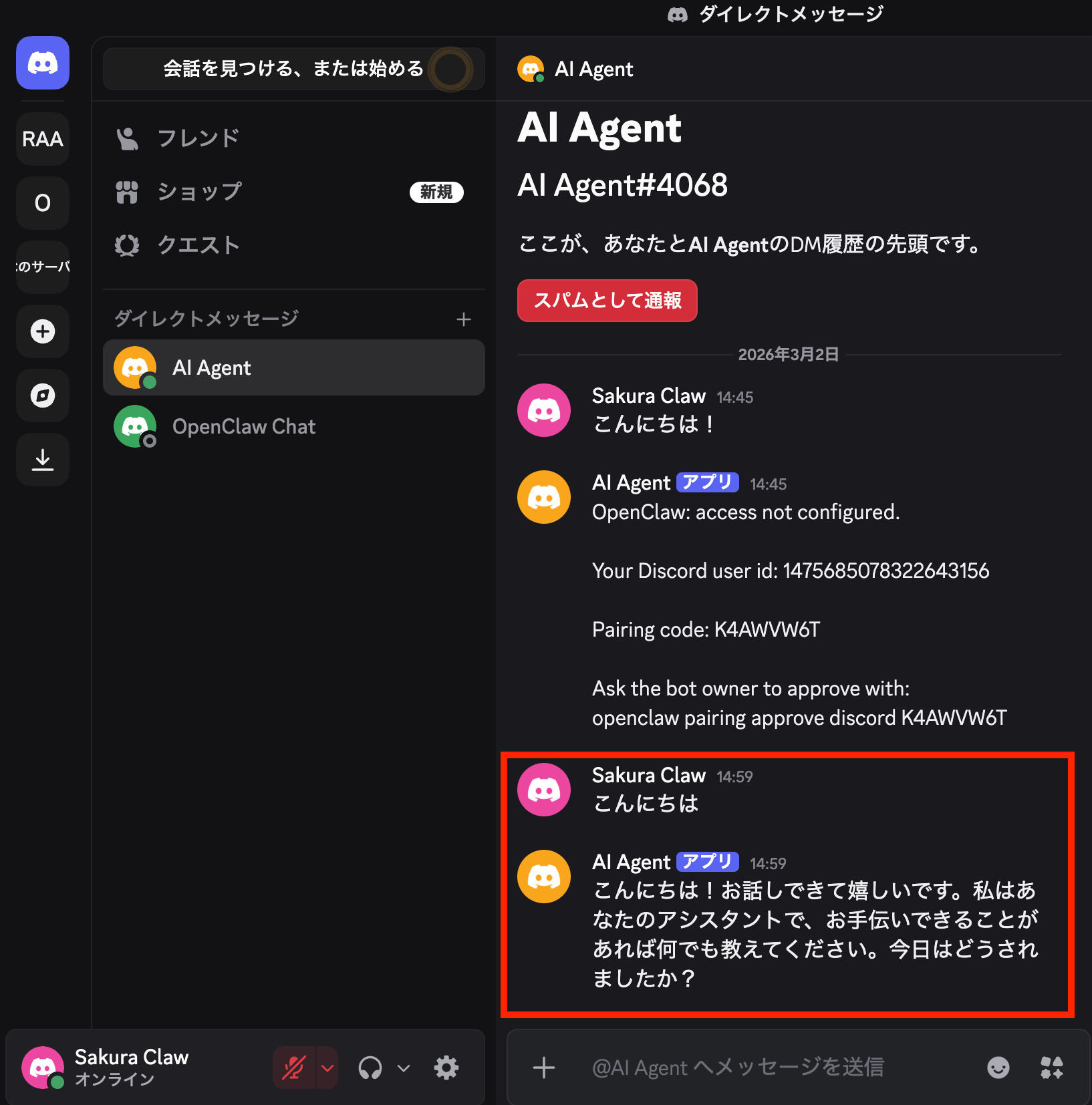 再度DiscordのDMでメッセージを送ってみて、OpenClawから返信が返ってくれば成功です。