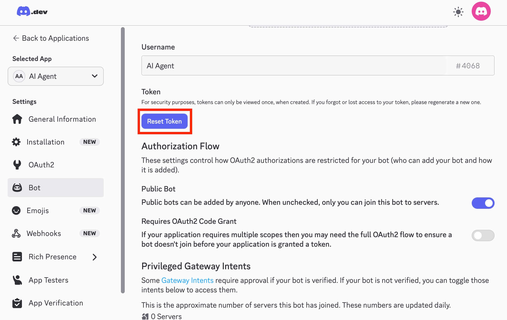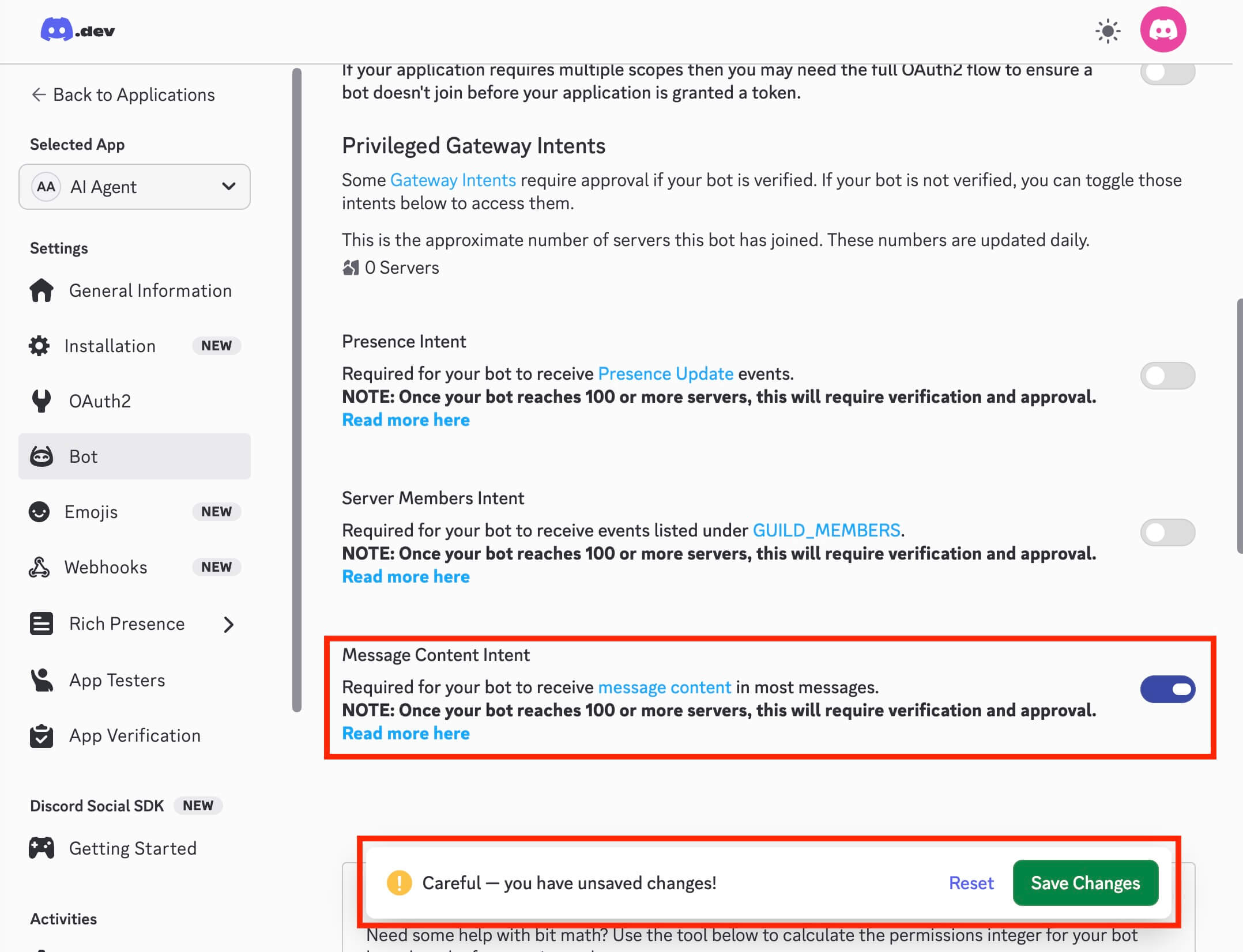 2. 右のブロックを下にスクロールして「Privileged Gateway Intents(特権インテント)」の「Message Content Intent」をONにします。下に表示されるポップアップの「Save Changes」をクリックして保存します。