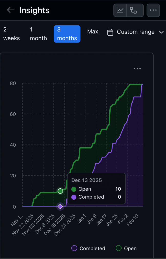 BackboneチームのProjectsでバーンアップチャートを出力してみました。最後に紫色のCompletedが緑色のOpenと合流しているのは、会期後に私が全てのIssueをクローズしたからです。紫色のCompletedは年末年始と会期直前に踊り場のように真横になっています。他の時点では大体急激な右肩上がりを表していて、非常に速いペースでIssueがクローズされていった様子が表れています。