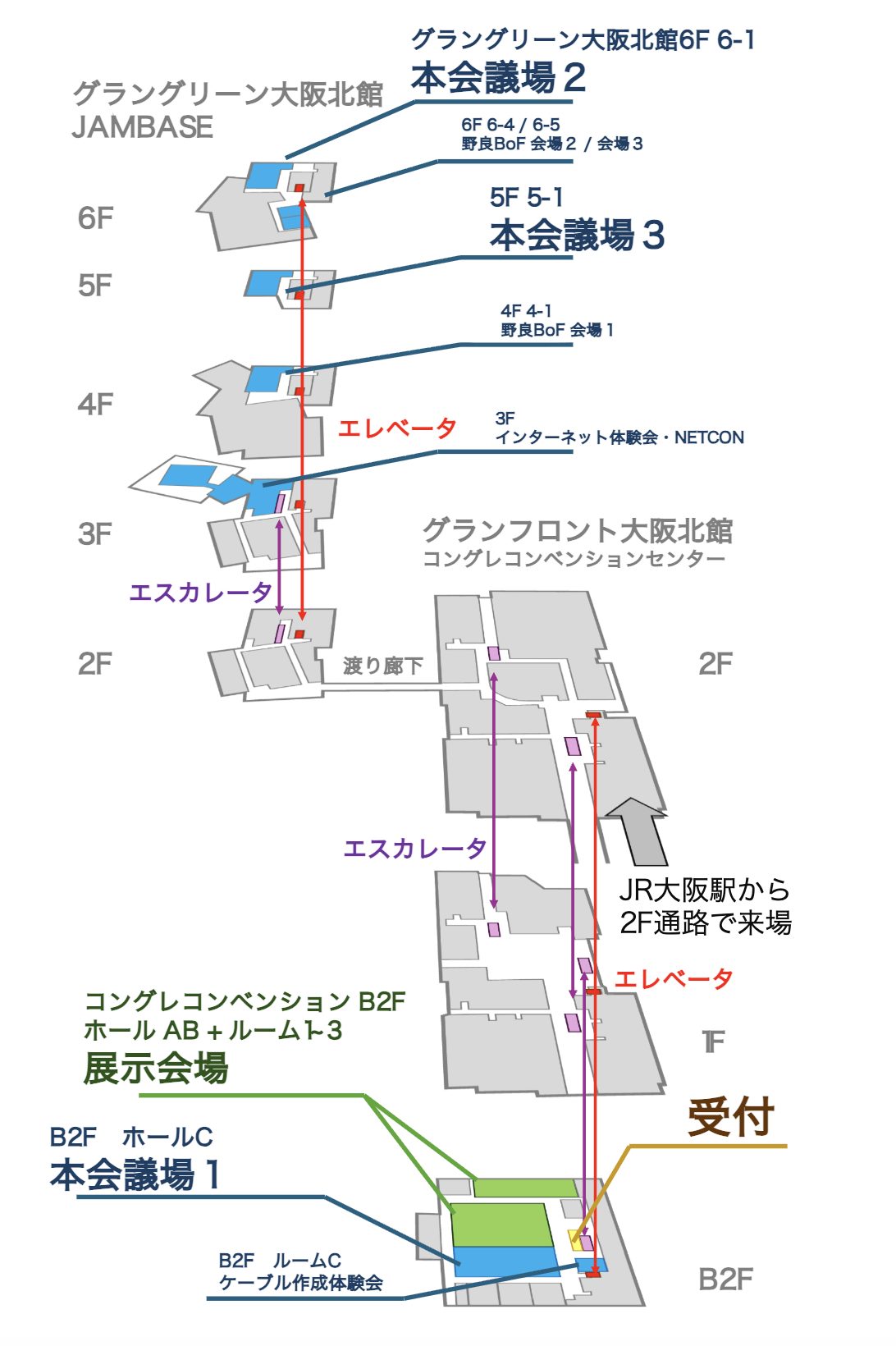 コングレコンベンションセンターと、JAMBASEと呼ばれる複数の会場がありました。それぞれ管理が違うため会場に引き込むことができる回線は別のものとなりました。これらをつなぐバックボーンとしてOCX(BBIX/BBSakura Networksが提供する「Open Connectivity eXchange」という閉域網クラウド接続サービス)が活躍しました。