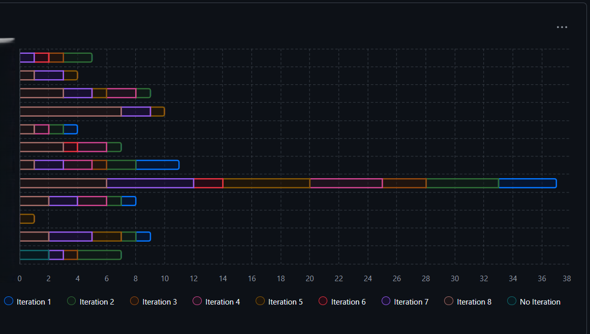 下記の画像は各メンバーごとにIssueアサインがあった数を表しており、色については各IterationでIssueをこなした量を表しています。グラフの左にいくほど、会期直前のIterationになります。Iteration2か3あたりから各自がIssueの処理を受け持ち始めた様子が確認できます。突出しているグラフが上述の学生リーダーの処理量を表しています。
