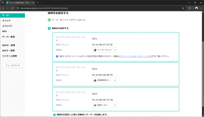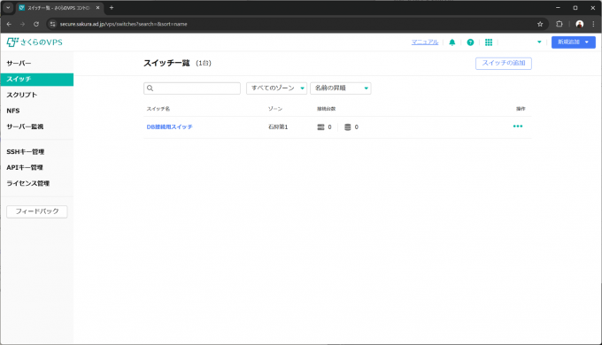 作成後、さくらのVPSのネットワークインターフェースのNIC2にそのスイッチを接続します。