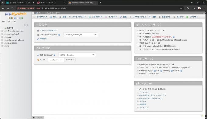 最初警告は出ますが、無事データベースに接続できました。アプリケーションに必要なテーブルやユーザは、ここで操作することができます。