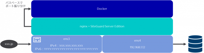 HTTPS対応とnginx+SiteGuard Server Editionのインストールも続けて行いました。nginxでHTTPSリクエストを受け付け、パスベースでDockerコンテナのポートに振り分けるような設定も行っています。