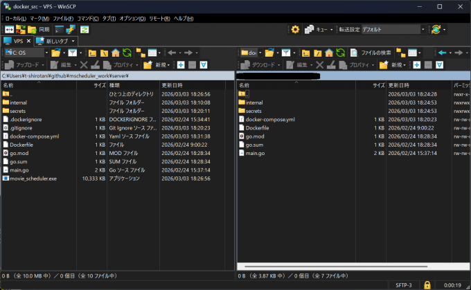 サーバ用のソースをWinSCPで転送し、