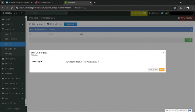 さくらのクラウドの画面に戻り、ブリッジ接続にVPSスイッチ接続を設定します。