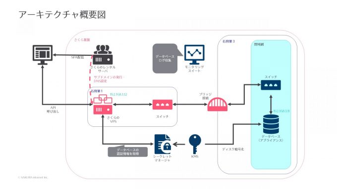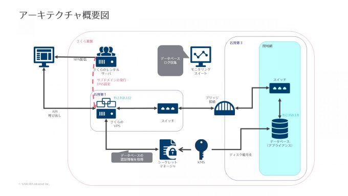 さくらのVPSをブリッジ接続を用いてデータベースアプライアンス(MariaDB)に閉域接続することで、クエリを投げられるようにしています。データベースの認証情報は、シークレットマネージャから取得します。