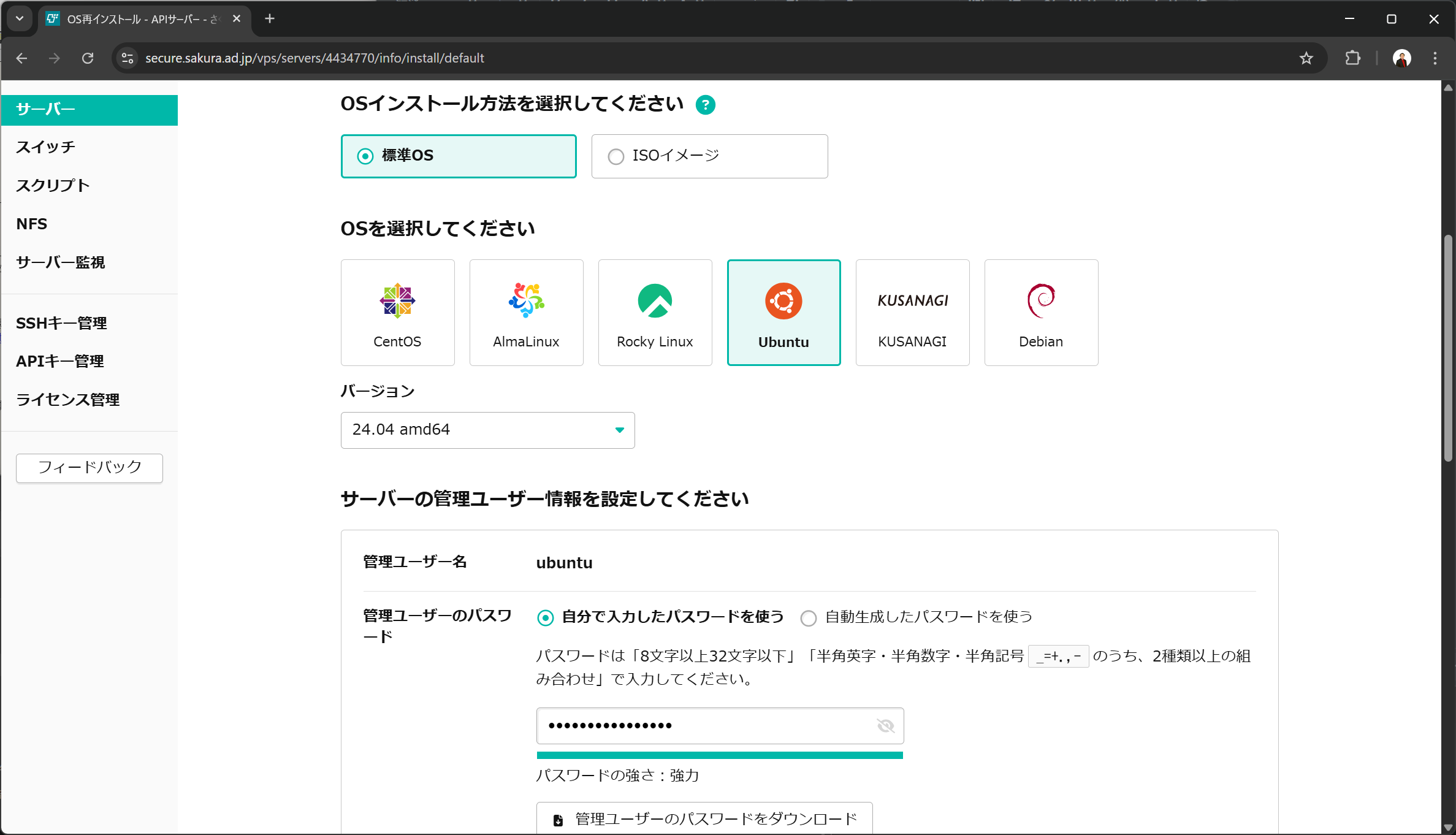 次に、さくらのVPSを構築していきます。1Gプランで、OSはUbuntu 24.04を選択しました。SSHキーは任意のものを登録します。