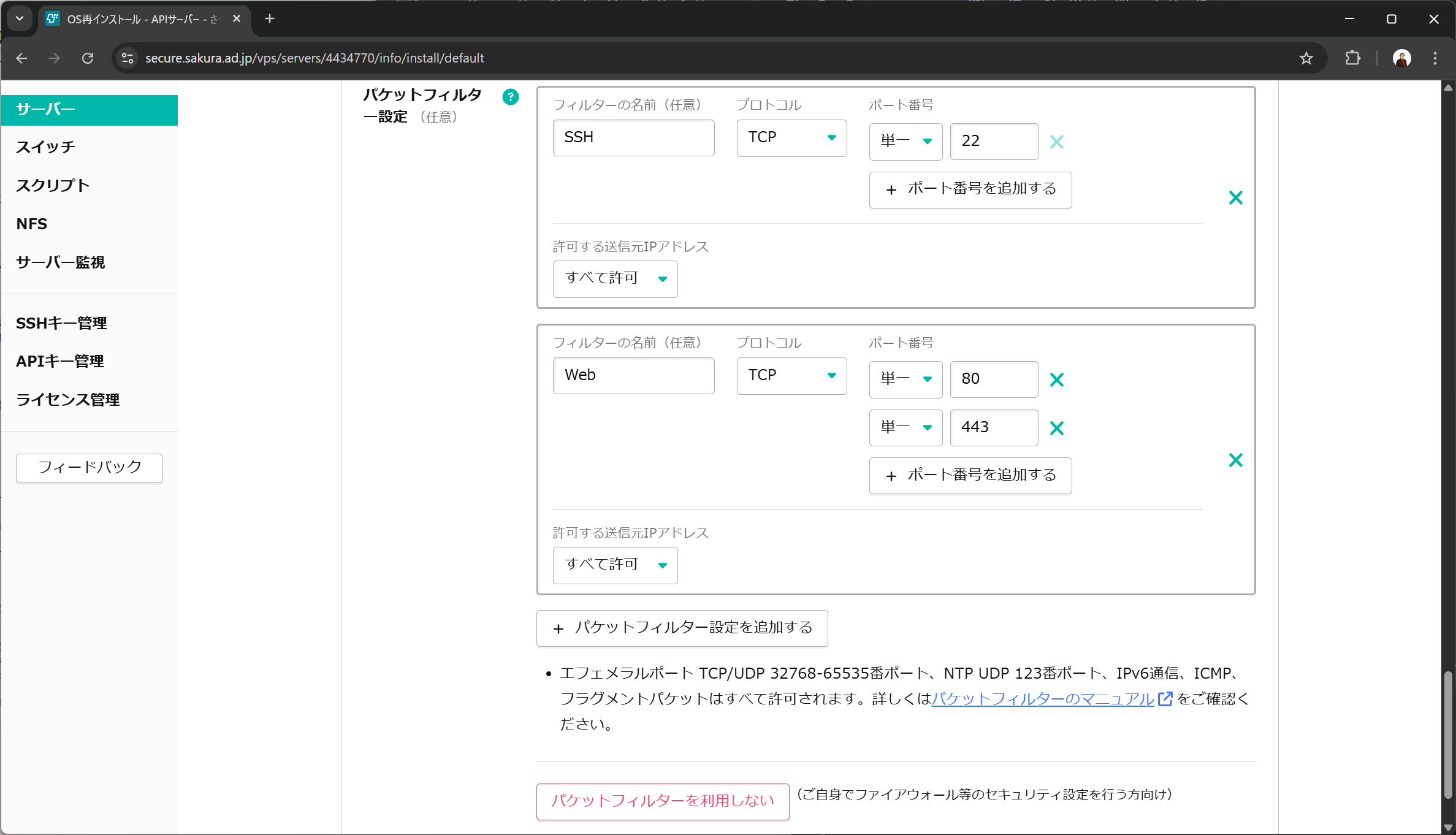 パケットフィルタの設定では、SSHとWeb向けのポートを開放します。SSHのポートは、送信元IPアドレスを運用担当者のグローバルIPアドレスに絞ることを推奨します。