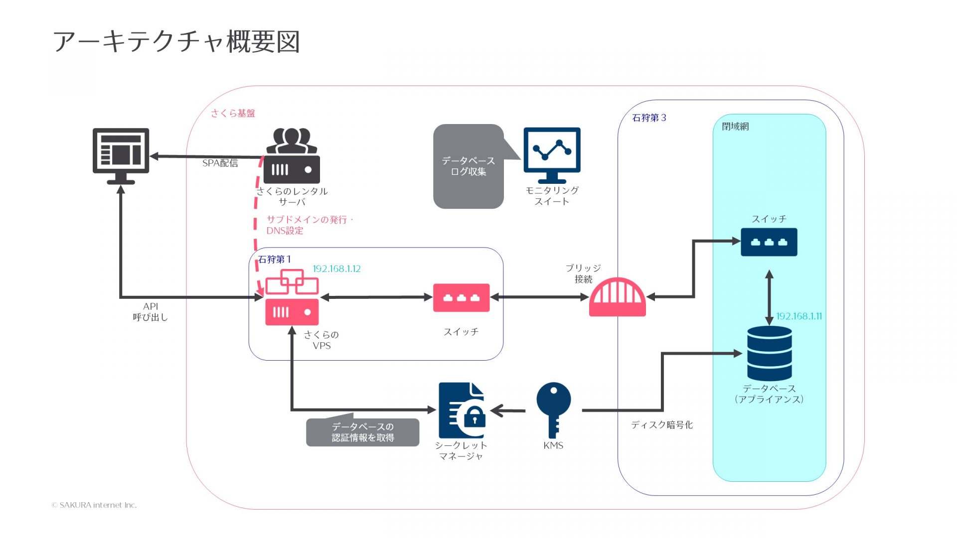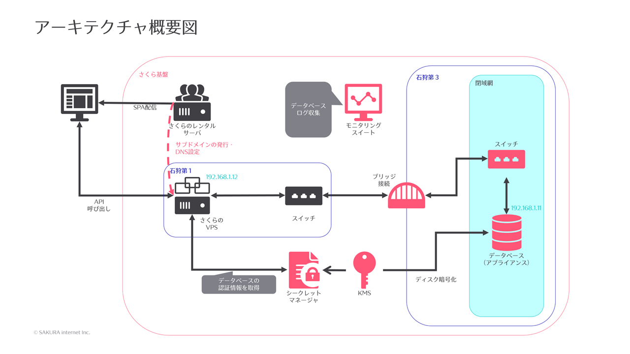 さくらのVPSをブリッジ接続を用いてデータベースアプライアンス(MariaDB)に閉域接続することで、クエリを投げられるようにしています。データベースの認証情報は、シークレットマネージャから取得します。
