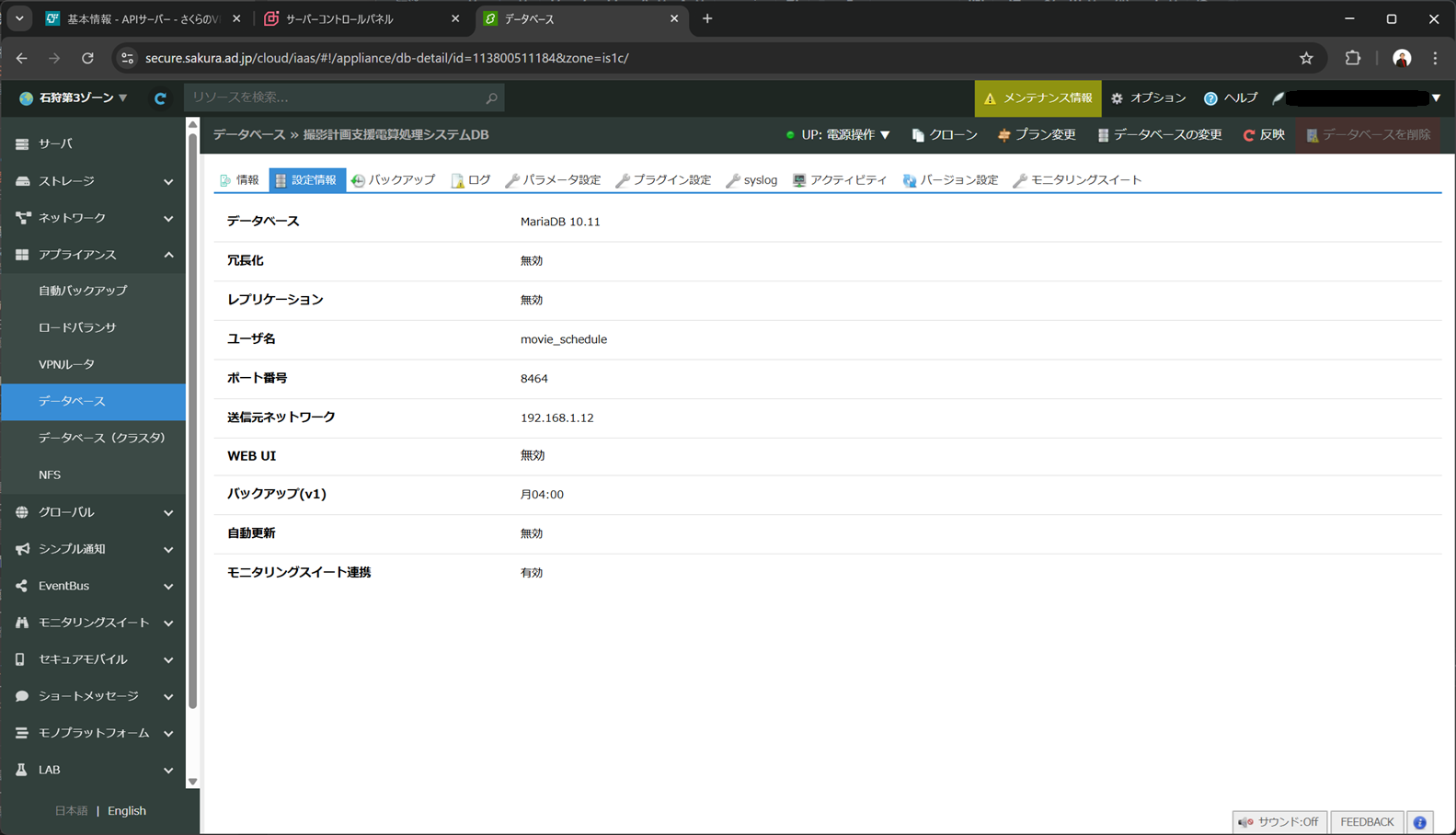 データベースのWeb UIを有効化します。コントロールパネルにアクセスし、データベース設定欄を開きます。