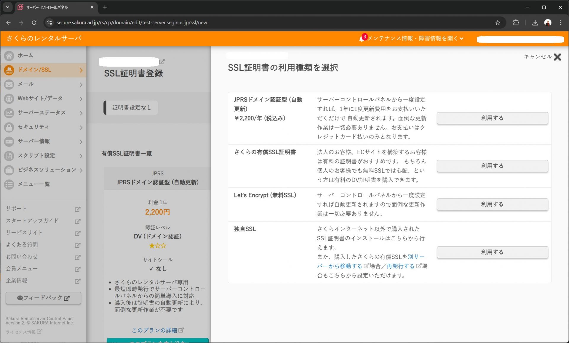 レンタルサーバの操作画面で、発行したサブドメインにSSL証明書を登録します。今回は個人でホストするだけなので、Let's Encryptで十分です。