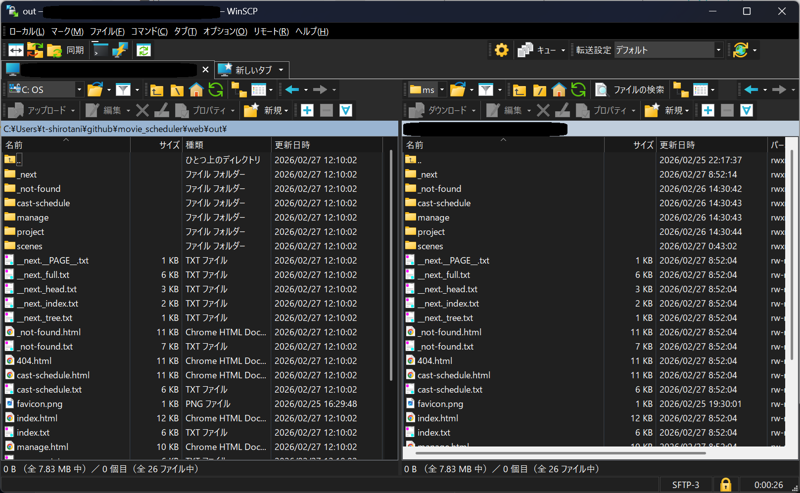サーバ用のソースをWinSCPで転送し、