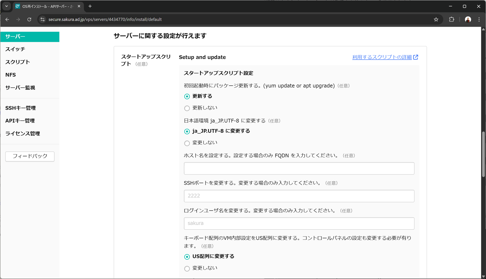 スタートアップスクリプトは、「Setup and update」の利用を推奨します。基本的な設定を一通り実施できます。1GBではややメモリが少ないので、このスタートアップスクリプトを用いて1GBのスワップも作成しました。
