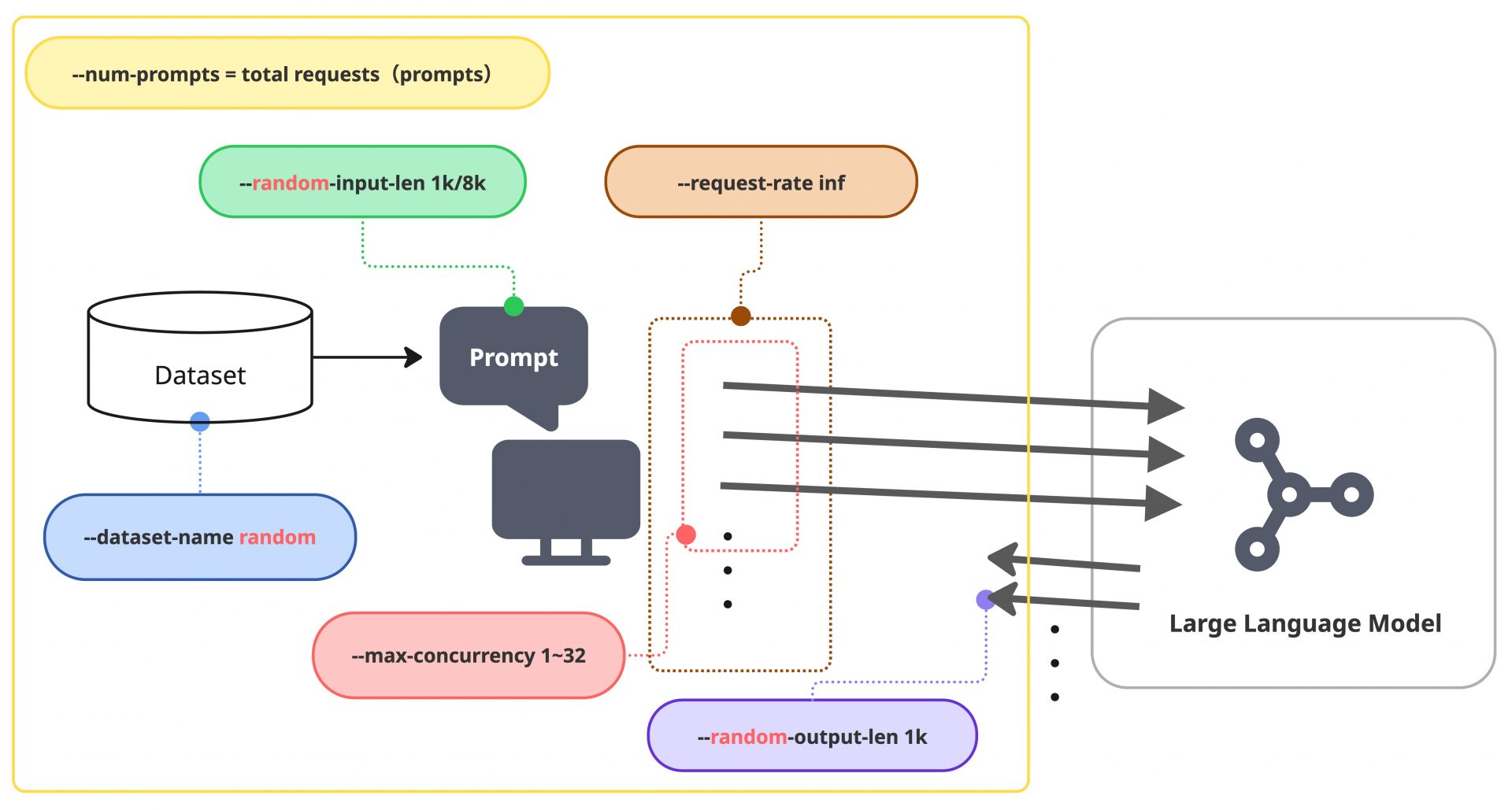 まずは各リクエストに関与する設定として、データセットや入力、出力長に関連するパラメータを決定します。データセットの設定(--dataset-name)は入力Tokenの様相を決定し、入力長、出力長のパラメータ(--random-input-len / --random-output-len)によって、各リクエストの様相を定めます。vllm bench serveで入出力長が変更できるデータセットはrandomかsonnetになります。randomデータセットはその名の通り、乱数をベースとしてToken IDを生成し、指定した長さに一致するようにプロンプトを構築します。一方でsonnetはあらかじめ用意されたテキストファイルからテキストのブロックをサンプリングしてプロンプトを構築するため、自然言語の様相を反映しているものの、指定した入力長には完全に一致せず、指定値に近い長さを持ったプロンプトになります。今回はrandomデータセットを選択し、具体的な入力長の設計として長いケースを8k、短いケースを1kと定め、この二つのパターンで測定することにしました。また、出力長は極端に短くなりすぎない程度を想定して 1k で固定としています。